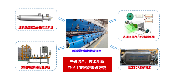 同时,团队研发了适用于纯氨燃烧的液氨气化及供给精确控制系统、烟气残余氨在线监测系统、高效液氨SCR脱硝系统等成套技术及装备;制定了一整套适用于氨燃料陶瓷窑炉的安全使用制度以及应急管理措施;并成功将以天然气为燃料的欧神诺陶瓷辊道窑炉,改造成能以纯氨和天然气混氨为燃料。