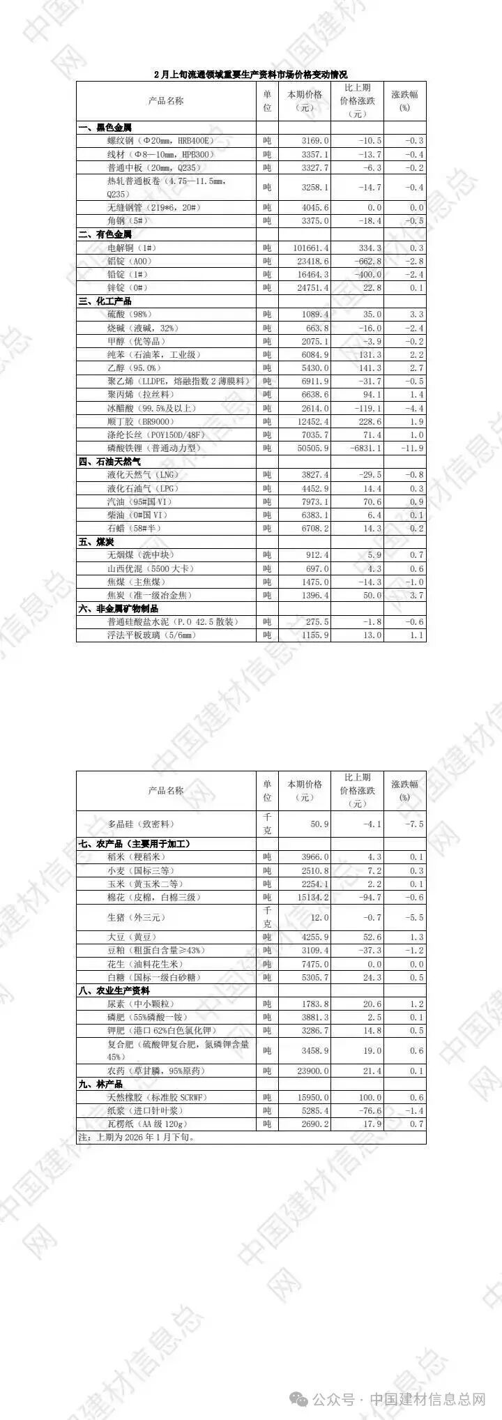 国家统计局近日对全国流通领域9大类50种重要生产资料市场价格的监测显示,2026年2月上旬与1月下旬相比,28种产品价格上涨,20种下降,2种持平。其中,包括普通硅酸盐水泥(P.O 42.5散装)、浮法平板玻璃(5/6mm)及多晶硅(致密料)3种非金属建材价格情况。