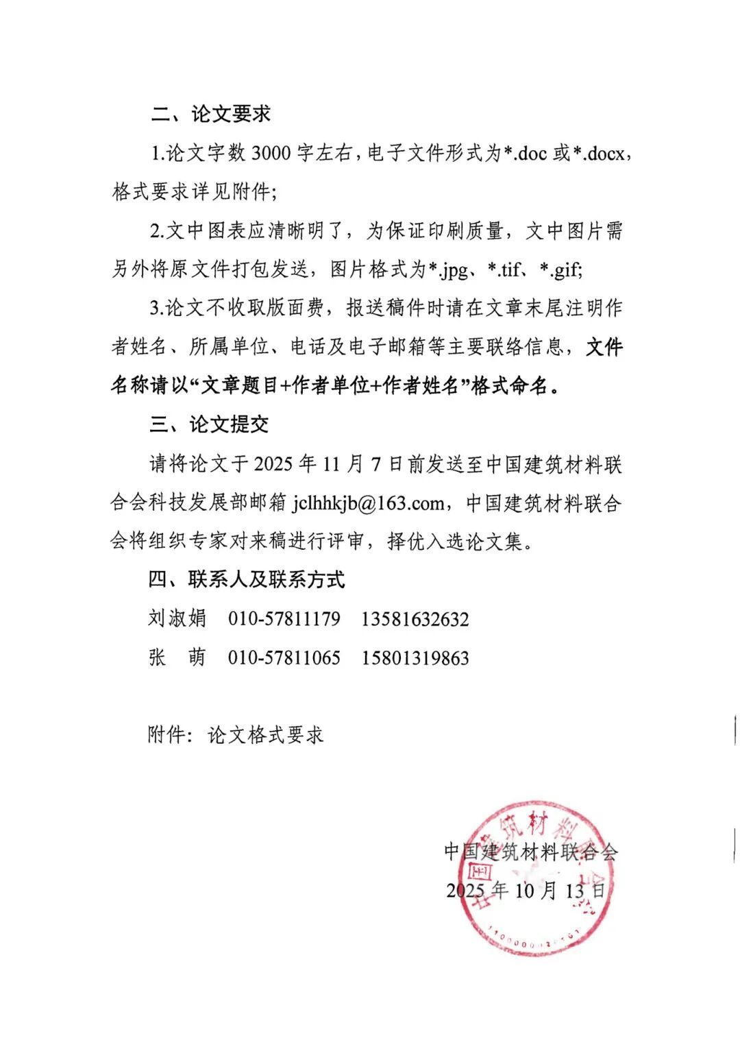 请将论文于2025年11月7日前发送至中国建筑材料联合会科技发展部邮箱jclhhkjb@163.com,中国建筑材料联合会将组织专家对来稿进行评审,择优入选论文集。
