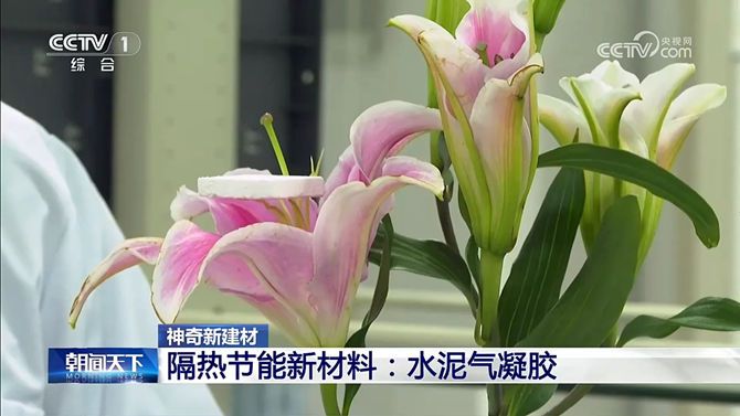 央视记者:作为一种建筑材料,安全无毒是一个必要的前提。由于这种气凝胶它的主要成分是水泥,所以它的性能非常稳定,即便是长时间的浸泡在鱼缸里,它也不会向水里释放任何有毒的物质,对鱼儿的健康没有任何影响。它的手感有点像我们日常包装行业的泡沫板,由于它的密度非常低,只有水的二十分之一,所以我们可以看到它在水面上漂浮的时候,沉在水面下的部分肉眼几乎难以察觉。 我们再来换一种方式感受一下它的重量到底有多轻。像火柴盒这么大小的一块气凝胶,我们把它放在鲜花上,花蕊甚至都没有被压弯。把镜头推进,我们可以观察到它甚至能够随着我手部传导的心跳在微微颤动。