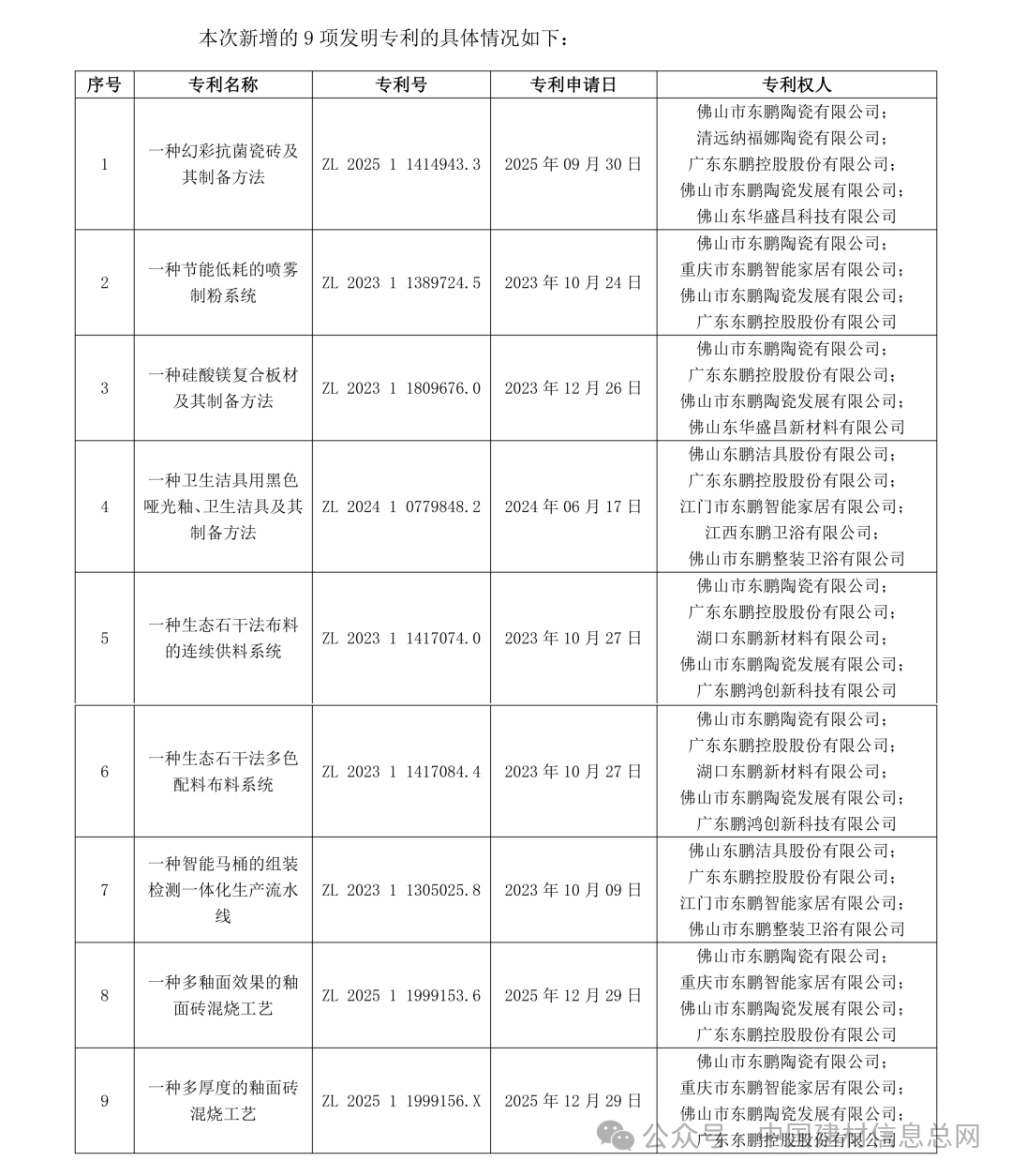 3月4日,东鹏控股(003012)发布公告称,公司及控股子公司于近日取得由国家知识产权局颁发的9项发明专利证书。 根据公告,9项专利名称分别为“一种幻彩抗菌瓷砖及其制备方法”“一种节能低耗的喷雾制粉系统”“一种硅酸镁复合板材及其制备方法”“一种卫生洁具用黑色哑光釉、卫生洁具及其制备方法”“一种生态石干法布料的连续供料系统”“一种生态石干法多色配料布料系统”“一种智能马桶的组装检测一体化生产流水线”“一种多釉面效果的釉面砖混烧工艺”和“一种多厚度的釉面砖混烧工艺”。 截至本公告披露日,公司及控股子公司累计取得各类型专利2571项,现有各类型有效专利1336项。