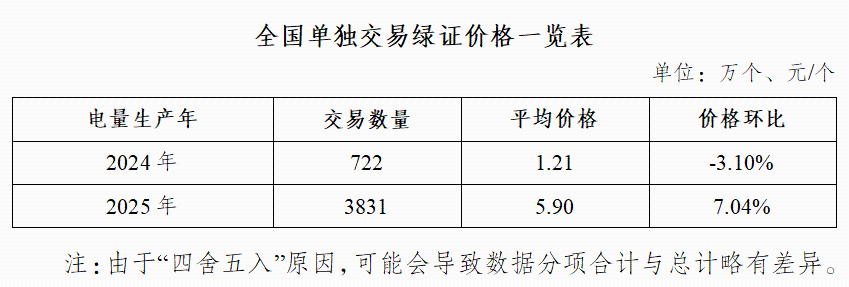 2026年2月,全国单独交易绿证4552万个,其中电量生产年为2024年的绿证交易722万个,平均价格1.21元/个;电量生产年为2025年的绿证交易3831万个,平均价格5.90元/个。