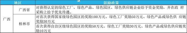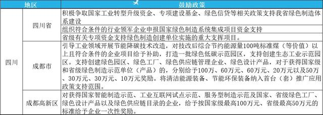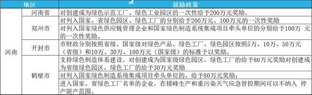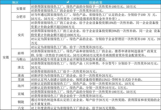西安市 对首次获得国家级、省级绿色制造名单(绿色工业园区、绿色工厂、绿色供应链)认定的企业,分别给予100万元、80万元奖励。对获得国家级、省级绿色设计产品认定的企业,每种产品分别给予10万元、8万元奖励,最高分别不超过100万元、80万元。企业同时获得国家级、省级绿色制造名单认定的按照“就高不重复”原则进行奖励。 榆林市 支持企业绿色化发展。对装备制造企业利用国家推广的清洁生产技术方案进行清洁生产技术改造的,按照实际投资额的5%予以补助,单个项目补助金额最高不超过200万元。鼓励企业采购环保设备或采用降低能耗的生产设备和工艺。对获得国家“绿色工厂”的装备制造企业一次性奖励100万元。(根据产业发展需要制定) 延安市 支持绿色制造体系建设。鼓励企业贯彻新发展理念,坚持绿色、低碳发展。对列入国家级、省级绿色工厂名单的企业,分别给予30万元、20万元奖励。对列入省级绿色(设计)产品、绿色园区、绿色供应链管理名单的,给予20万元奖励。(责任单位:市工信局、市发改委、市生态环境局、市财政局) 渭南市 围绕“两新一重”,统筹推进工业领域重大基础设施配套及新型基础设施建设,对获得国家智能制造、工业强基、工业互联网、绿色制造等相关资金支持的,给予奖励;对国家级“单项冠军”示范企业、培育企业、“单项冠军”产品分别给予奖励;对通过国家两化融合管理体系贯标认证、新获得绿色园区、绿色工厂等称号的企业,给予奖励。 宝鸡市 鼓励企业技术改造升级。以高端化、智能化、绿色化为 方向,鼓励企业采用新技术、新工艺、新设备、新材料进行改造 提升,重点抓好投资 30 亿元的航天液体动力制造产业基地、宝鸡机床智能产业园、宝鸡卷烟厂制丝生产线升级改造、法士特伊顿轻量化变速器等100 个重点技改项目,推动制造业关键基础材料、核心基础零部件(元器件)、先进基础工艺、产业技术基础实现产业化突破。加快数字化改造,创建一批省级智能制造试点示范 企业、智能工厂、智能车间、智能产线。推进绿色制造体系和绿色制造项目建设,积极打造绿色工厂、绿色园区和绿色供应链,对获得国家级绿色制造的企业和园区给予一次性奖励 20 万元。 汉中市 汉中市人民政府印发关于工业倍增十条支持政策的通知。通知称:宜兴市加强示范引领。汉中市对获得国家级制造业创新中心、“单项冠军”和专精特新“小巨人”企业的,一次性奖励300万元;对新认定为国家智能制造、绿色工厂(园区)、工业强基、工业互联网示范企业或平台的,一次性奖励100万元;对新认定为国家级工业设计中心、服务型制造企业(平台)以及企业公共服务机构(平台)的,一次性奖励50万元;对首次通过国家两化融合管理体系贯标认证的企业,一次性奖励30万元;对首次取得军工“三证”之一的企业,一次性奖励50万元。 铜川市 铜川市人民政府办公室印发关于支持铝产业高质量发展的若干措施的通知。通知称:铜川市指导铝产业企业强化品牌意识,对创建高新技术企业、“专精特新”企业、智能制造示范企业、两化融合贯标示范企业、绿色工厂、著名商标等,成功创建为省级、国家级的,分别一次性奖励企业20万元、50万元。 商洛市 实行绿星赋能。开展绿色园区、绿色企业、绿色工厂、绿色机关、绿色校园、绿色医院、绿色景区、绿色家庭、绿色交通、绿色建筑等绿色创建,实施生态县、镇、村绿色星级评定,将绿星等级与银行存贷款利率、享受政策资金扶持、财政转移支付、绿色发展考核等挂钩,实现生态信用赋能。与南京、天津、西安等地探索开展零碳会议碳排放撮合交易,实现会议碳中和。 |
