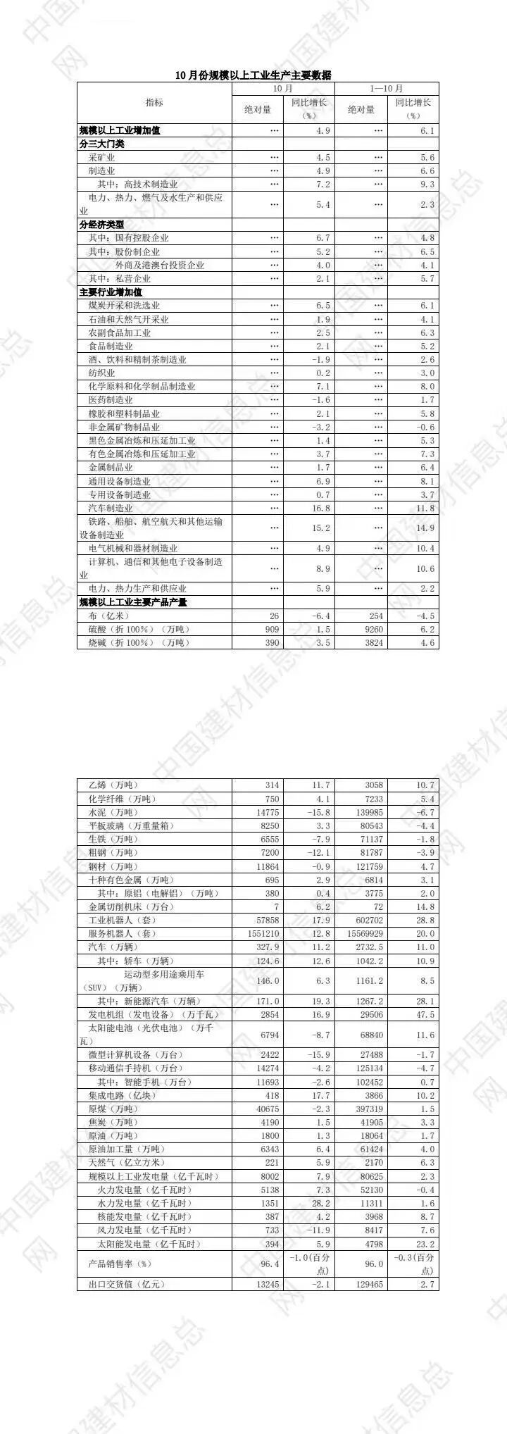 1—10月份,规模以上工业增加值同比增长6.1%。其中,全国水泥产量累计139985万吨,同比下降6.7%。平板玻璃产量累计80543万重量箱,同比下降4.4%。