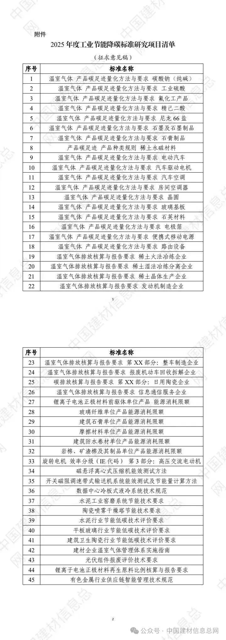 为充分发挥标准引领作用,更高水平更高质量做好工业和信息化领域节能降碳工作,10月28日,工信部确定2025年度工业节能降碳标准研究项目并予以公示。其中,包括建材行业多个领域的标准研究项目,为行业节能降碳工作划定新 “标尺”。 根据公示,建材行业涉及建筑石膏单位产品能源消耗限额、玻璃纤维单位产品能源消耗限额、建筑防水卷材单位产品能源消耗限额、水泥工业窑磨系统节能技术要求、水泥行业节能低碳技术评价要求、建筑卫生陶瓷行业节能低碳技术评价要求及建材企业温室气体管理体系实施指南等多项关键标准研究项目。 这些标准涵盖了建材生产的能源消耗管控、核心生产系统节能技术、行业低碳技术评价及温室气体管理体系建设等多个维度,将从技术规范、评价体系、管理机制等层面为建材行业节能降碳工作提供全方位支撑。 其中,建筑石膏、玻璃纤维、建筑防水卷材等产品的单位产品能源消耗限额标准,将明确行业能耗管控的量化指标,推动企业对标达标,倒逼生产工艺升级。 水泥工业窑磨系统节能技术要求和多个细分行业的节能低碳技术评价要求,将为企业节能技术改造和低碳技术应用提供清晰指引,加速先进节能低碳技术在建材领域的推广应用。 建材企业温室气体管理体系实施指南,则有助于企业建立系统化的温室气体管理机制,提升碳管理水平。 据悉,此次公示时间为2025年10月28日至11月3日。期间,社会各界可针对这些标准研究项目提出意见建议,共同推动建材行业节能降碳标准体系的完善与发展。