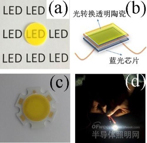 中国科学院宁波材料技术与工程研究所特种纤维与核能材料工程实验室研究人员经过四年的努力,近期通过与韩国岭南大学材料与工程系JaehyungLee合作,解决了两相复合陶瓷界面相容性问题和低光散射损耗的高透明陶瓷制备技术,成功将陶瓷荧光粉镶嵌入热膨胀系数匹配的铝基透明陶瓷基体中。该透明陶瓷片的热导率达到14W/m﹒K(硅胶和环氧树脂在0.4W/m﹒K),将传统封装中的被动发光模块的热导率提高了两个数量级。研究团队通过调整荧光粉的颜色和含量,获得了不同发光要求的光转换透明陶瓷片型号。 |