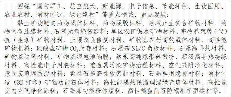 (一)指导思想 坚持以习近平新时代中国特色社会主义思想为指导,牢固确立新发展理念,围绕“宜业尚品、造福人类”的发展新目标,转变发展方式,优化产业结构、增强创新能力,提升产业水平,加大非金属矿物功能材料在“农业农村、乡村振兴、新能源、电子信息、环境治理、国防军工”等领域的生产与应用,加快构建行业双循环新发展格局,为我国经济社会的健康发展和重点领域的非矿材料供应安全提供保障。力争实现我国由非金属矿大国向非金属矿强国的转变。 (二)基本原则 按照“市场需求牵引、重视基础研究、把握共性关健、重构研发平台、完善创新机制”的要求,完善“针对性、持续性、有效性”科技创新服务的体制和机制,进一步增强企业为主体、政府与协会共同发力、科研院所深度参与、财政金融配合支撑的行业集约式“自立自强、自主创新”的科技创新能力。 促进产业规模与资源、环境的协调发展;推动上下游产业间协同发展;落实产业化与新型工业化、信息化的同步发展;推进以市场化为手段,资源、资本为纽带的产业整合重组,促进产业高级化发展。 推动非金属矿产业的绿色转型、低碳发展。加快绿色矿山、绿色制造体系完善和实施工作,保护和修复生态环境,如期实现“碳达峰”,“碳中和”目标。 加强产业整合,优化要素配置,推进资源的集群化、集约化、规模化、高端化开发。积极构建“资源循环、产业集群、生产集约、产业成链、服务配套、规模效益”的发展新业态。 (三)发展目标 展望2035年,我国将基本实现社会主义现代化,建成现代化的非金属矿工业体系,跻身世界非金属矿工业强国。产业规模效益显著,行业全面协调发展;国际国内开发并举,资源安全保障有力;产业布局合理,产品结构先进;产学研用创新链完善,原创性科技创新驱动强劲;关键技术装备材料自主供给,供应链安全可靠;行业绿色、低碳、数字、智能化水平一流;标准化体系健全,质量品牌突出;支撑国民经济社会发展作用突出,成为国家重要支柱产业。 —产业结构不断优化。非金属矿产业整体效益逐年提升,产业集群集约化发展水平明显提升。以优势矿种综合开发的产业集团(园区)和“专精特新”小巨人企业成为产业发展中坚力量。建设30个主营业务收入超5亿元、200家主营业务收入超过1亿元的规模效益好、示范作用强、产业特色鲜明的国家级非金属矿资源高效开发利用示范基地和示范企业,成为支撑我国非金属矿产业发展的重要力量。行业总产值力争达到1.2万亿元,我国迈入世界非金属矿工业强国行列。 —供给水平明显提高。各类非金属矿的产品种类更加丰富,品质明显提升,产品的质量标准、检验检测、认证认可体系基本完善并逐步与国际标准接轨。遴选培育100个生产制造示范项目和20个供应链示范平台,石墨、萤石、重晶石、石英等战略性非金属矿产品的供应保障安全可靠。 —创新能力显著增强。以企业为主体的技术创新体系进一步健全,积极探索设立产业创新发展基金,行业研发投入强度超过2.5%;实施《产业发展技术路线图》,创建一批区域性、园区式技术创新平台,攻克50项以上数字化先进开采、短流程智能选矿、保护矿物结构特殊加工、在线监测与检测系统等技术与装备,智能制造、服务型制造、“互联网+协同制造”取得明显成效。 —质量品牌建设成效显著。进一步健全企业质量品牌管理体系。加强全面质量管理,主要非金属矿产品质量总体达到国际先进水平。深度开展品牌培育,产品的品牌附加值、市场影响力和应用领域认可度不断提高,适应市场需要的品牌体系基本建立。 —低碳绿色发展更加深入。深入践行绿色发展理念,实施《非金属矿行业碳达峰碳中和行动方案》。到2025年,清洁能源使用量提高50%,减少生产过程碳排放30%,节能降耗减排用非金属矿物功能材料产业值占比10%,确保2030年非金属矿行业实现碳达峰,碳排放总量同比2020年减少80%。全面推进非金属矿绿色矿山建设,实现“三率”指标达标,进一步深化行业绿色制造体系建设,绿色工厂、绿色园区、绿色产品及绿色产业链创建工作取得显著成效。 (四)重点任务和重点工程 1.重点任务 结合全国矿产资源规划(2021-2025年)实施等契机,加大对未来可能出现保障危机的石墨、萤石、石英、云母等战略性及短缺非金属矿资源的勘探力度。加大对大型及超大型优势非金属矿资源的勘探勘查力度。提升我国非金属矿产业持续发展的优质资源保障程度。 进一步调整和优化产业组织结构,以特色产业集群及产业园区为载体,推进建设国家非金属矿资源高效开发利用示范基地和示范企业。积极培育一批资源配置能力强、技术引领能力强、品牌影响力强的有国际影响力和竞争力的龙头企业。积极引导中小型企业向“专精特新”小巨人企业发展。支持产业链上下游和相关领域的技术联盟、采购联盟、生产联盟等建设。 着重开发面向“国防军工、航空航天、新能源、电子信息、节能环保、生物医药、农业农村、增材制造、绿色建材”等重点领域及新兴产业的矿物功能材料及相关产品,全面优化非金属矿产品供给结构。重点保证涉及国家重大工程建设、国防安全、国计民生等重要领域的非金属矿物基础原辅料及矿物功能材料供应。 专栏2:重点发展矿物功能材料