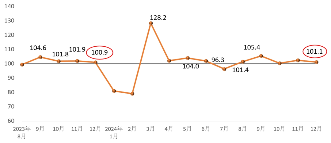 一、12月份建筑材料工业景气指数 2024年12月份,建筑材料工业景气指数为101.1点,比11月份回落1.3点,比上年同月高0.2点,高于临界点,处于景气区间,行业经济运行保持平稳。