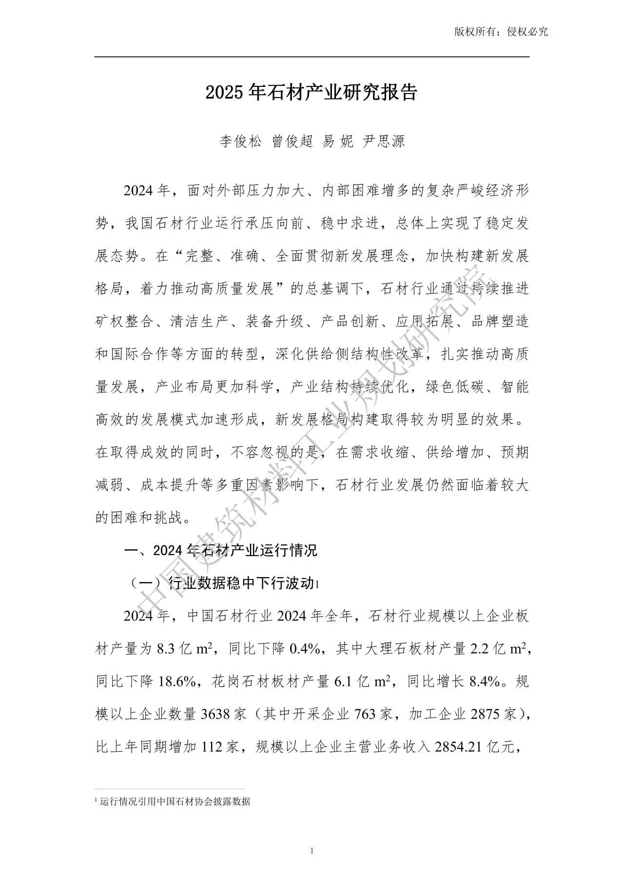 《非金属材料产业研究报告(2025)》日前发布,中国建筑材料工业规划研究院石材产业研究院执行院长李俊松对其中的石材产业进行解读。 》》》详情如下: