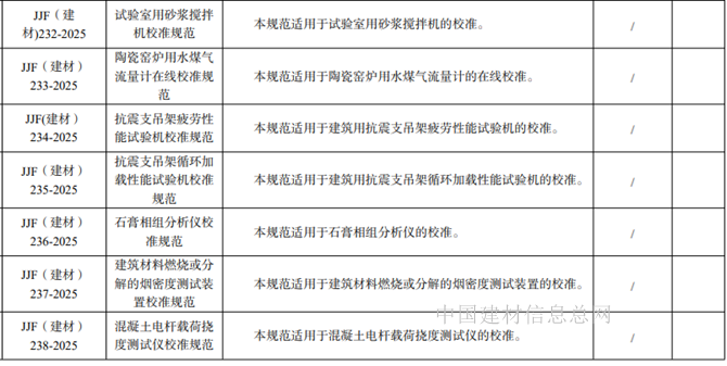 据介绍,128项行业计量技术规范涉及《试验室用砂浆搅拌机校准规范》《陶瓷窑炉用水煤气流量计在线校准规范》《抗震支吊架疲劳性能试验机校准规范》等15项建材行业计量技术规范。