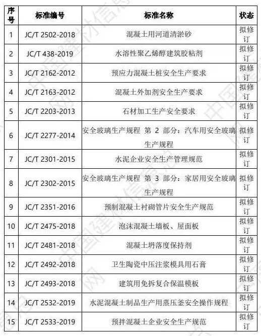 在拟修订的359项行业标准中,包括15项建材行业标准。