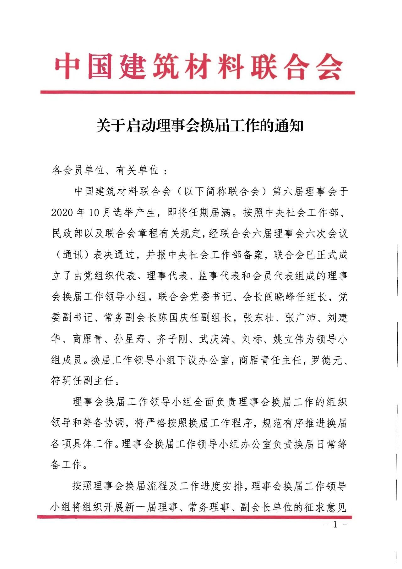 各会员单位、有关单位: 中国建筑材料联合会(以下简称联合会)第六届理事会于2020年10月选举产生,即将任期届满。按照中央社会工作部、民政部以及联合会章程有关规定,经联合会六届理事会六次会议(通讯)表决通过,并报中央社会工作部备案,联合会已正式成立了由党组织代表、理事代表、监事代表和会员代表组成的理事会换届工作领导小组,联合会党委书记、会长阎晓峰任组长,党委副书记、常务副会长陈国庆任副组长,张东壮、张广沛、刘建华、商雁青、孙星寿、齐子刚、武庆涛、刘标、姚立伟为领导小组成员。换届工作领导小组下设办公室,商雁青任主任,罗德元、符玥任副主任。 理事会换届工作领导小组全面负责理事会换届工作的组织领导和筹备协调,将严格按照换届工作程序,规范有序推进换届各项具体工作。理事会换届工作领导小组办公室负责换届日常筹备工作。 按照理事会换届流程及工作进度安排,理事会换届工作领导小组将组织开展新一届理事、常务理事、副会长单位的征求意见及确认工作,并同期开展五年来理事会工作的回顾。欢迎建材及上下游行业企业加入联合会大家庭,共同推进建材行业绿色低碳安全高质量发展。 联系人:符 玥 010-57811569 13811332580 罗德元 010-57811062 13811131248 中国建筑材料联合会理事会换届工作领导小组 2025年10月13日
