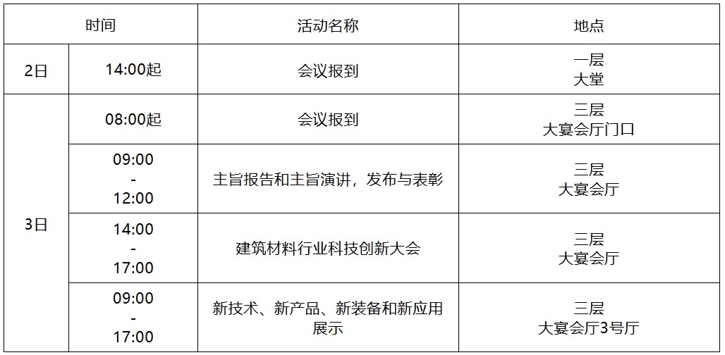 各会员单位、有关单位: 为深入学习宣传贯彻党的二十届四中全会精神,落实党中央、国务院决策部署,总结“十四五”期间建材行业取得的成绩,加快构建现代化建材产业体系,扎实推进建材行业绿色低碳安全高质量发展,积极践行“宜业尚品、造福人类”行业发展目标,推动建材行业“十五五”期间更好的服务国家战略的实施,中国建筑材料联合会(以下简称联合会)定于2025年12月3日在浙江宁波召开2025年建筑材料行业大会,期间召开行业科技创新大会。 12月4日,联合会与住建部科技与产业化发展中心还将在行业大会后共同主办首届建筑材料应用创新大会,着力推进“好材料”适配“好房子”工作,加速推动“好材料”供给体系建设,加快促进建筑材料行业和建筑建设领域深度融合发展(会议通知另行发放)。 一年一度的行业大会已成为引领建筑材料行业发展的风向标,本次行业大会内容丰富、形式多样,诚挚邀请您拨冗参加。现将行业大会有关事项通知如下。 一、大会主题 创新驱动 绿色引领 以高质量发展促进建材产业体系变革 二、大会特色内容 1.会长主旨报告; 2.建筑建设领域与建材工业协同发展主旨演讲; 3.建材科技大讲堂:院士专题报告; 4.建筑材料行业“宜业尚品”突破性新技术新产品发布。 三、大会主要活动 1.主旨报告和主旨演讲 联合会会领导围绕大会主题作主旨报告;邀请政府有关部门领导围绕建筑建设领域与建材工业协同发展作主旨演讲。 2.建筑材料行业“宜业尚品”突破性新技术新产品发布会 发布、宣传和推广建材行业最新突破、世界首创的新技术、新产品。 3.建筑材料行业科技创新大会 邀请院士、专家围绕行业前沿技术、建筑材料行业“揭榜挂帅”重大技术攻关等方面专题交流,会议通知另行发放。 4.表彰与发布 表彰2024年度建筑材料科学技术奖获奖项目、2024年度入选工信部团体标准应用推广典型案例的中国建筑材料协会标准,发布第五批全国建筑材料行业“揭榜挂帅”项目榜单揭榜单位、2026年建筑材料工业景气指数MPI、全球建筑材料上市公司综合实力、第三届建筑材料工业设计创新大赛成果、首届建筑材料行业人工智能创新应用大赛成果、2025建材春晚观众喜欢节目。 5.新技术、新产品、新装备和新应用展示 展示行业优秀企业的新技术、新产品、新装备和新应用。 四、大会参会人员 1.特邀国家有关部委领导; 2.联合会驻会领导、执行副会长、副会长、常务理事、理事及会员单位代表; 3.有关院士、联合会专家委委员; 4.建筑材料企业、科研院所、高校、检测认证评价机构等代表,有关获奖单位及个人代表; 5.新闻媒体代表。 五、大会活动安排 1.活动时间、地点 (1)时间:2025年12月3日 (2)地点:宁波泛太平洋大酒店 2.活动安排