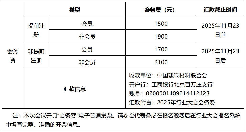 扫码进入“行业大会报名系统” 2.本次会议收取会务费,鼓励参会人员提前注册。报名参加12月3日上午会议以及建筑材料行业科技创新大会的参会代表,仅收取一次会务费(含会议期间资料费及餐费)。其中,联合会执行副会长、副会长不收取会务费。