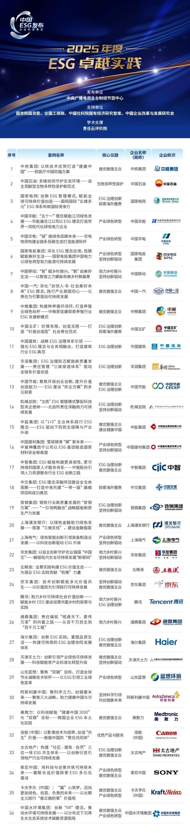 中央广播电视总台“中国ESG(企业社会责任)发布”连续第三年聚焦中国企业在环境、社会和治理(ESG)实践中的卓越成果,推出《2025年度ESG卓越实践报告》。 |