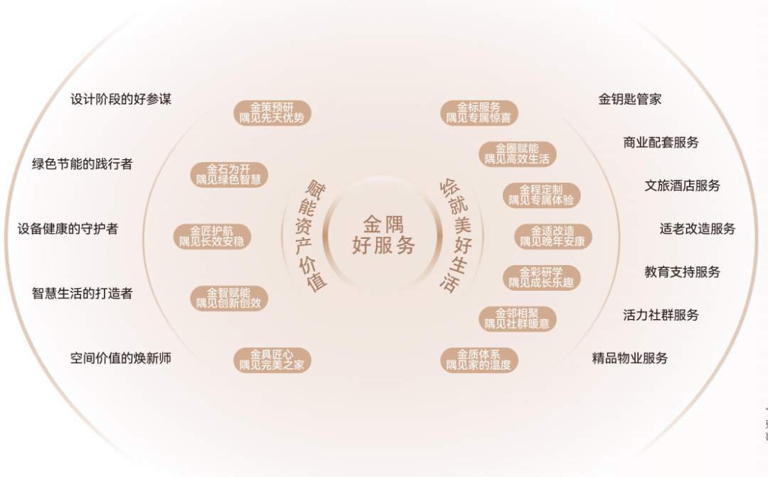 金隅以“选择一次,信任一生”为服务承诺,构建“好服务赋能资产价值”与“好服务汇就美好生活”双体系。资产服务涵盖设计优化、节能改造和智慧运维,致力于提升物业长期价值。生活服务包括金钥匙管家、适老化改造、亲子教育和文旅配套等七类服务。用心构筑安全、便捷、舒适而充满活力的现代化社区、全龄友好社区,让资产价值与人文关怀在这里和谐相融,用好服务,为资产增值,为生活添彩