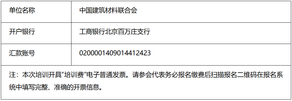 报名二维码 2. 学费会员单位每人1800元,非会员单位每人2000元,含授课费、培训教材、证书、场地等。请各报名参加培训人员于12月12日前完成培训费缴纳汇款(汇款注明:标准培训+培训人员姓名)。12月12日以后缴费人员,将培训结束后统一开具发票。汇款信息如下: