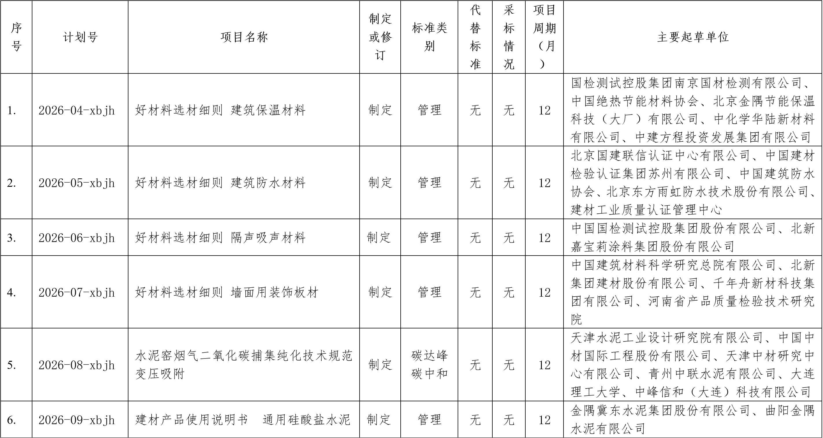 各有关单位: 经研究,现下达《好材料选材细则建筑保温材料》等6项协会标准制定计划(见附件),请各有关单位按照《中国建筑材料协会标准管理办法》认真组织落实。在标准起草中要注意统筹处理好标准制定与技术创新、试验验证、知识产权处置、产业化推进、应用推广间的关系,加强与有关各方的协调,广泛听取意见,确保标准编制质量和水平;要定期向我会标准质量部报告标准项目的工作进展情况,按工作程序和计划完成协会标准制定、审查和报批工作。 附件:2026年第二批协会标准计划项目汇总表 中国建筑材料联合会 2026年1月29日 附件