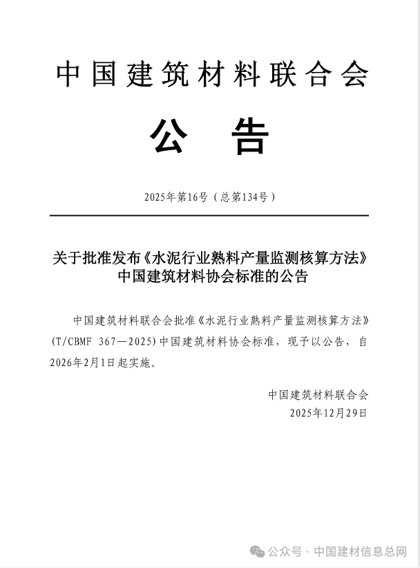 中国建筑材料联合会批准发布《水泥行业熟料产量监测核算方法》(T/CBMF 367-2025)。该标准于2025年12月29日公告发布,自2026年2月1日起实施。