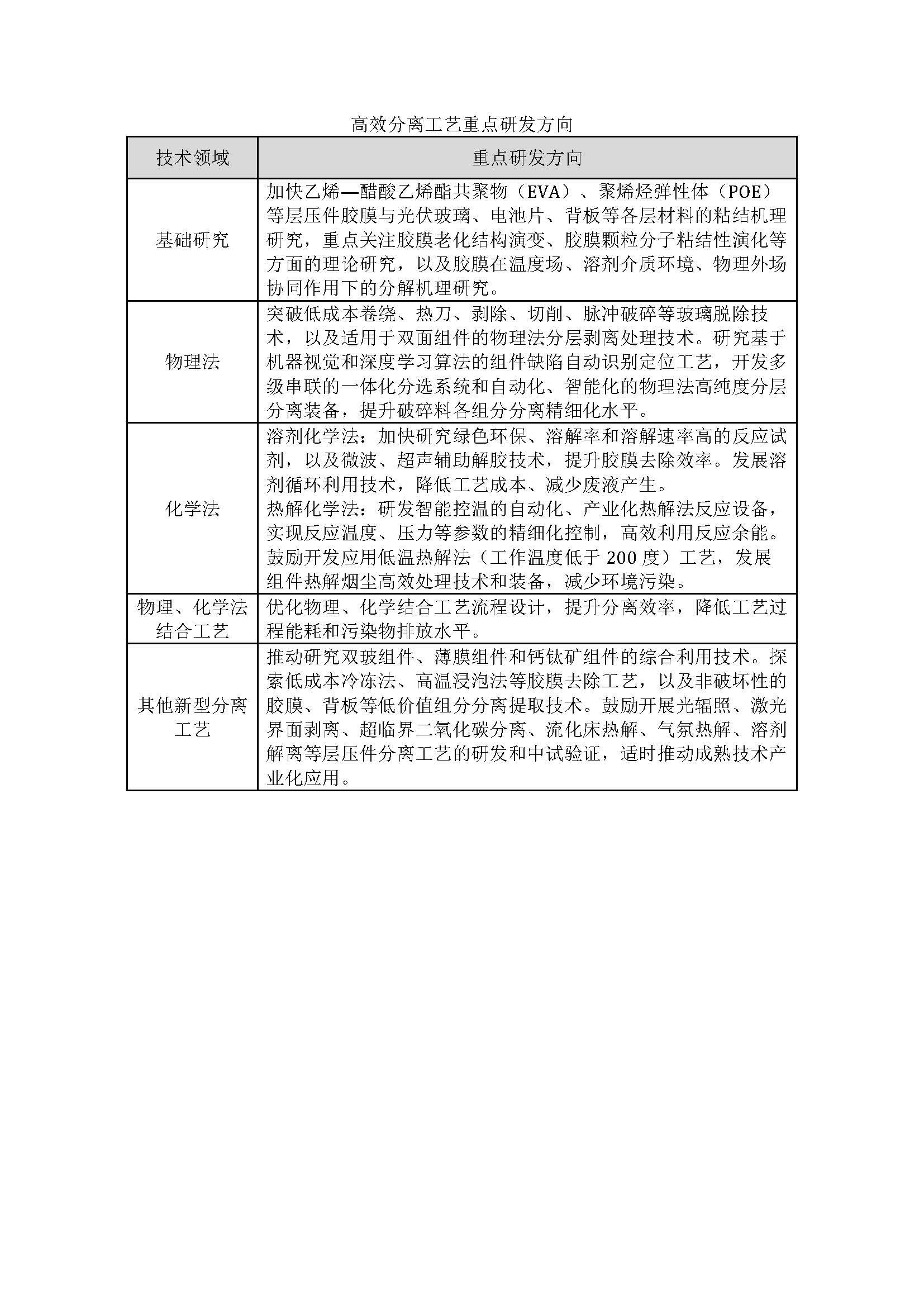 工业和信息化部等六部门关于促进光伏组件综合利用的指导意见 工信部联节〔2026〕48号 各省、自治区、直辖市及计划单列市、新疆生产建设兵团工业和信息化、生态环境、商务、市场监管、金融监管、能源主管部门,有关中央企业,有关行业协会: 为贯彻《中华人民共和国固体废物污染环境防治法》,落实《制造业绿色低碳发展行动方案(2025—2027年)》,提升光伏组件综合利用水平,提出以下意见。 一、总体要求 以习近平新时代中国特色社会主义思想为指导,全面贯彻落实党的二十大和二十届历次全会精神,认真落实全国新型工业化推进大会部署,以全面提高光伏组件综合利用水平为目标,完善法规政策标准,强化工艺技术研发,拓宽产品应用路径,加强要素支持保障,推动光伏组件综合利用产业健康有序发展。 到2027年,光伏组件绿色生产水平进一步提高,再生材料使用比例有效提升,组件报废评价标准和检验检测方法得到完善。表层结构拆解、层压件高效分离、组分提取等关键技术取得突破,废旧光伏组件综合利用产品在金属冶炼、装备制造、建材生产等重点领域的应用规模进一步扩大,制定一批光伏组件绿色设计和综合利用方面的技术标准,培育一批废旧光伏组件综合利用骨干企业,光伏组件综合利用量累计达到25万吨。到2030年,光伏组件综合利用技术装备水平进一步提升,产业创新发展能力明显增强,综合利用产品应用场景和应用方式不断拓展,形成产业链上下游协同紧密、产能布局合理、能够应对大规模退役潮的废旧光伏组件综合利用能力。 二、推进光伏行业绿色设计和制造 (一)提升光伏组件易拆解、易利用水平。依法实施光伏行业清洁生产审核。鼓励光伏组件生产企业采用易拆解、易分离的胶粘材料,探索非交联结构胶膜材料,为报废后高效拆解利用创造条件;鼓励选用无氟背板、无铅焊带、无铅金属浆料等绿色原材料,降低光伏组件综合利用环保处置成本。(工业和信息化部、生态环境部按职责分工负责) (二)提升再生材料使用比例。支持光伏玻璃、晶硅材料、接线盒、铝边框等光伏组件零部件生产企业与再生资源综合利用企业加强合作,提升组件零部件中再生塑料、再生硅材料、再生有色金属、再生玻璃等的使用比例。鼓励光伏组件生产企业在满足性能要求的前提下,优先采购再生材料含量水平高的光伏边框、金属浆料、光伏玻璃等,提升光伏组件中再生材料使用比例。(工业和信息化部负责) 三、推动光伏组件有序报废退役 (一)明确光伏组件报废判定标准。结合装机组件特点、性能等,加快研究制定光伏组件报废评价技术标准,明确报废评价程序、技术要求和评价方法。鼓励应用无人机电致发光(EL)成像检测、热成像检测、人工智能在线监测等方法,有效识别光伏组件功能结构完整性、安全水平及功率衰减情况等,为组件维护与报废判定提供参考。(工业和信息化部、市场监管总局、国家能源局按职责分工负责) (二)引导相关方规范交售废旧光伏组件。引导光伏组件生产企业、光伏电站、电站施工方等光伏组件所有方分别将生产过程中产生的废品、使用过程中出现质量问题的次品、运输和施工损坏造成的残品、光电转化效率较低或寿命到期的退役组件等交售至综合利用企业。生产企业、光伏电站、电站施工方等委托他人运输、利用、处置报废光伏组件的,应当对受托方的主体资格和技术能力进行核实,约定污染防治要求。(工业和信息化部、国家能源局、金融监管总局、生态环境部按职责分工负责)完善光伏电站退役管理政策,指导光伏电站有序开展升级改造和退役。(国家能源局负责)支持各地、有关行业协会、龙头企业建设废旧光伏组件交易平台,强化废旧组件交易信息共享,提升交易效率和透明度。(工业和信息化部、商务部按职责分工负责) 四、推动绿色高效拆解利用 (一)提升拆解精细化水平。加快光伏组件高效拆解技术攻关,鼓励应用自动化清洗、冲切、拆分设备,提升组件拆解效率和精度。研发智能识别多尺寸、多类型光伏组件的自适应拆解系统,加快开发应用移动式、模块化的快拆技术装备,推广“即到即拆”模式,满足多地形高效回收、灵活处理的应用场景,降低搬运、运输等非技术成本。支持将分布式快拆技术与物联网、智能物流数据分析技术融合,提升组件拆解资源调配效率。(工业和信息化部负责) (二)突破高效分离工艺。开展光伏组件胶膜粘结机理研究,丰富完善胶膜低成本解离技术理论体系。加快研发晶硅单玻、双玻等组件的物理法、化学法、结合工艺及新型分离工艺,攻克光伏组件部件与胶膜的绿色、高效分离技术,鼓励开发非破坏性拆解技术,探索完整玻璃等材料获取路径。详见附件《高效分离工艺重点研发方向》。(工业和信息化部、生态环境部按职责分工负责) (三)推动光伏组件有价组分高效提纯。鼓励提取晶硅电池片金属栅线的银材料,探索采用非酸性或弱酸性溶剂进行银浸提,提升工艺过程环保水平。加快研究酸法提银过程中的试剂循环利用技术,提升酸液回用率。研究储备少银化组件精细提纯工艺。鼓励从焊带、汇流条中提取铜、铅、锡等金属元素,分级分质利用光伏组件中的硅元素,根据多晶硅、铝硅合金、有机硅生产企业对再生材料的要求,采用湿法、火法等工艺提升硅料纯度。研究玻璃