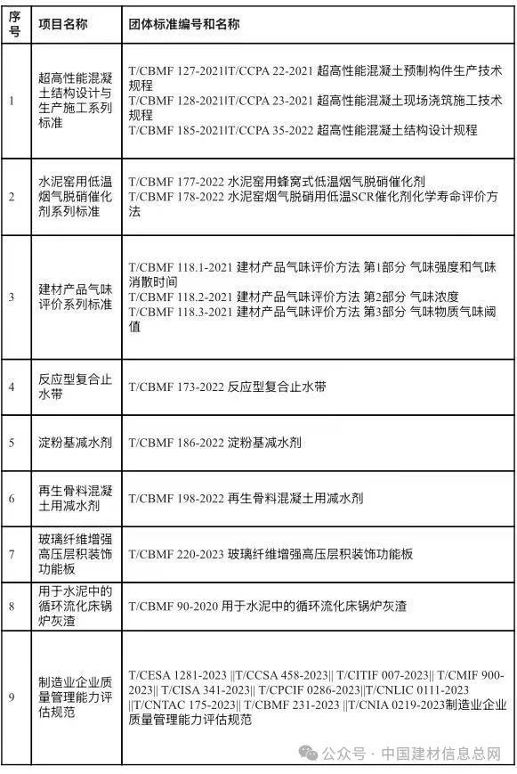 表1 中国建筑材料协会标准入选工业和信息化部2024年团体标准应用推广典型案例名单