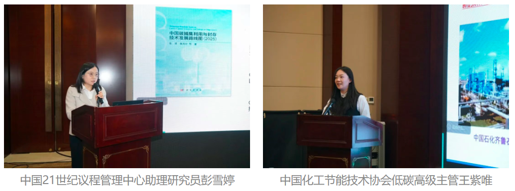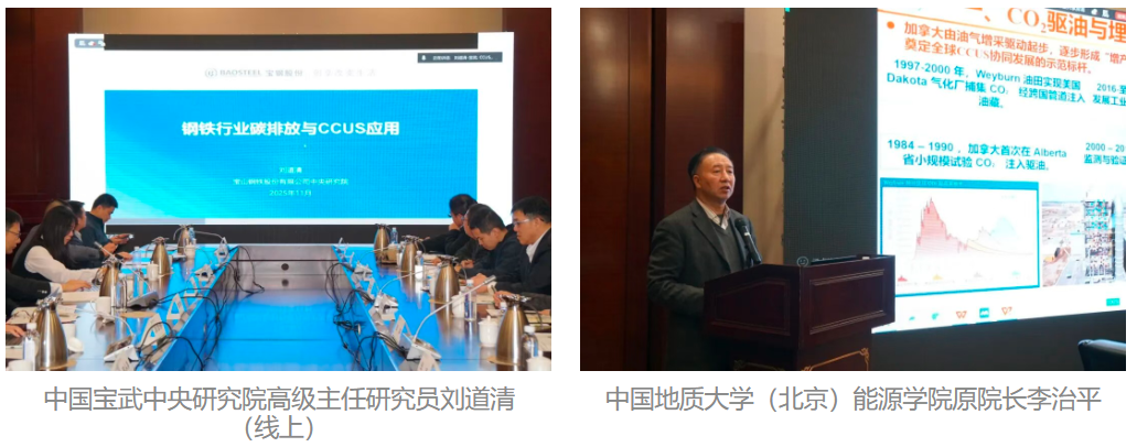在嘉宾报告环节中,中国21世纪议程管理中心助理研究员彭雪婷介绍了《中国碳捕集利用与封存技术发展路线图(2025)》,路线图将“双碳”目标下CCUS的角色定位,从战略储备技术提升为碳中和技术体系中不可或缺的重要组成部分;中国化工节能技术协会低碳高级主管王紫唯介绍了石化行业CCUS技术发展、标准体系建设、国内外工程实践以及产业集群的发展现状并展望了我国CCUS发展趋势;华润建材科技首席专家陶从喜介绍了华润建材二氧化碳原位捕集技术研发以及华润水泥(封开)全链条CCUS项目建设情况;中国石化胜利油田分公司CCUS项目部副经理周亮从高低浓度碳源捕集技术、管道输送技术、陆相油藏技术以及多项态二氧化碳注入等方面分享了胜利油田CCUS技术进展及矿场实践的典型经验;中国宝武中央研究院高级主任研究员刘道清介绍了钢铁行业碳排放和CCUS建设应用情况,并从技术成本、技术瓶颈、技术标准、源汇匹配、商业模式、跨行业协作以及安全等方面分析了钢铁行业应用CCUS面临的挑战;中国地质大学(北京)能源学院原院长李治平教授介绍了二氧化碳驱油与封存的发展历史、技术原理、应用案例及未来发展趋势。