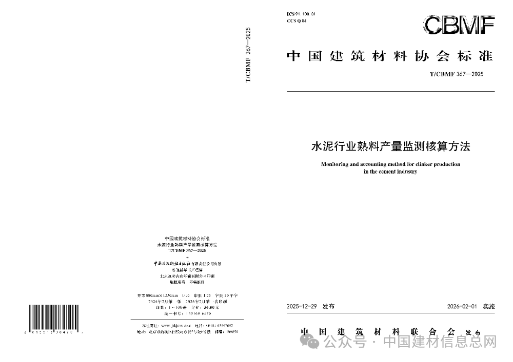中国建筑材料联合会批准发布《水泥行业熟料产量监测核算方法》(T/CBMF 367-2025)。该标准于2025年12月29日公告发布,自2026年2月1日起实施。