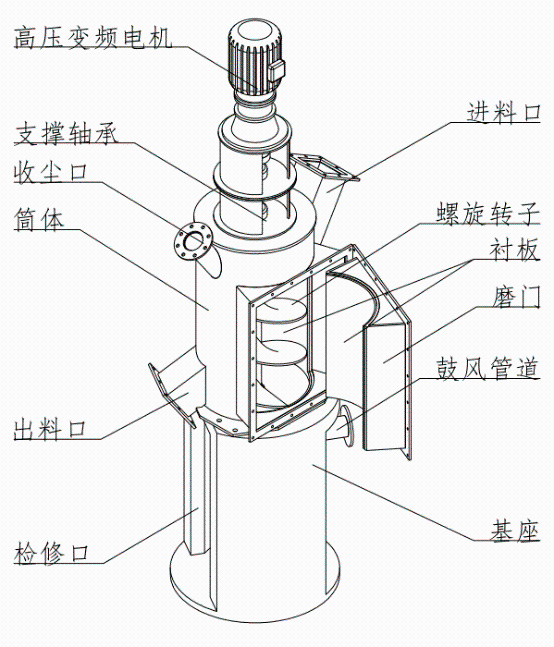 该立式研磨整形装备创新点在于,采用筒体侧上方进料、侧下方出料,创新出料装置,设置出料篦子和控制装置,依靠重力和离心力出料,本身不耗能,实现进出料平衡;增设鼓风和收尘装置,筒体上端面设置收尘口,下端面设置鼓风口;研磨介质和衬板采用刚玉替代金属材质,避免重金属污染。