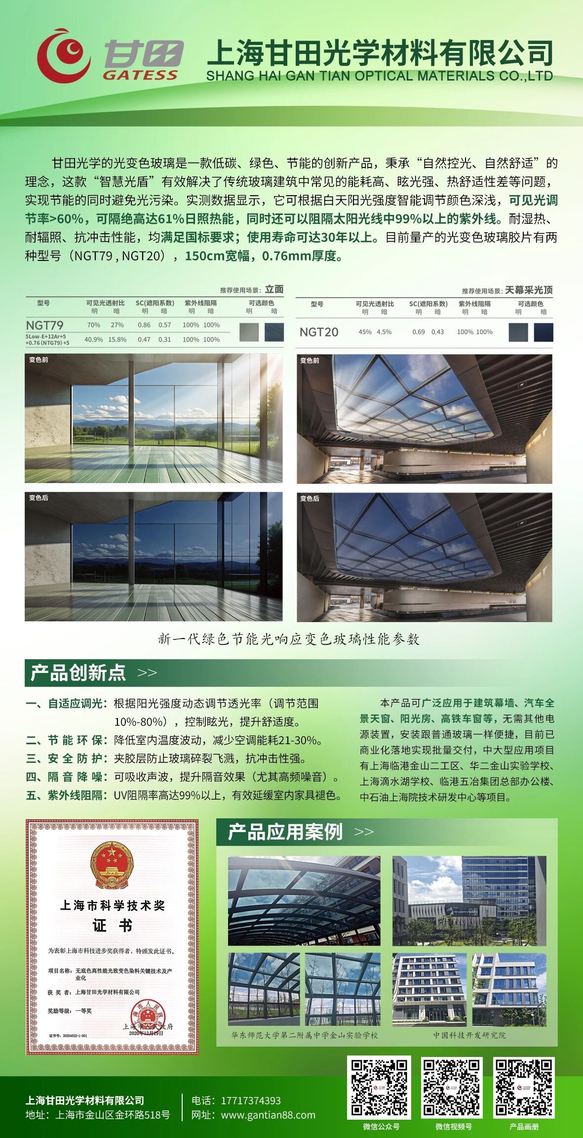 甘田光学开发出节能环保光变色玻璃胶片,其合成玻璃为节能环保智能产品。该产品可根据白天阳光强度智能调节颜色深浅,隔绝高达61%日照热能,同时还可阻隔太阳光线中99%以上的紫外线,并保持视野高透性。可用于建筑幕墙、汽车天窗、阳光房、高铁车窗等场景,无需其他电源装置,安装方便快捷,节能节电绿色元素助力区域经济新质生产力发展。