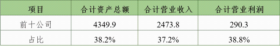 与2024年前十名公司相比,本次前十名公司的合计资产总额减少1.8%,合计营业收入减少5.3%,合计营业利润增加3.0%。前十名公司的合计资产总额、合计营业收入在百家公司总额中的占比分别减少1.5个百分点和0.9个百分点,合计营业利润占比则增加2.1个百分点。头部企业保持了较强的盈利能力。