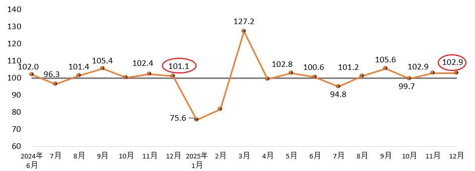 2025年12月,建筑材料工业景气指数为102.9点,高于临界点,处于景气区间,与上月持平,比上年同月高1.8点,建材行业运行保持平稳。