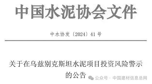 6月6日,中国水泥协会发布《关于在乌兹别克斯坦水泥项目投资风险警示的公告》,2024年5月15日,中国水泥协会在北京召开了“投资乌兹别克斯坦水泥企业座谈会”。在与当地投资水泥企业充分沟通后,中国水泥协会发出以下警示提醒:中资水泥企业在乌兹别克斯坦投资需谨慎;有序竞争自律经营,共同维护健康市场生态;发挥先进产能引领作用,高质量共建“一带一路”。