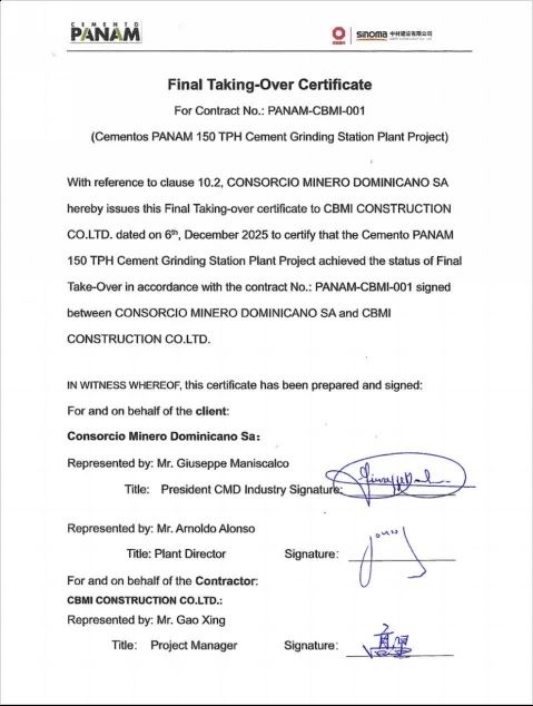 中材建设多米尼加PANAM粉磨站项目喜获最终验收证书