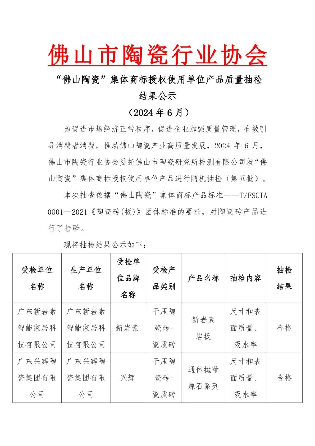 “佛山陶瓷”集体商标授权使用单位产品质量抽检结果公示
