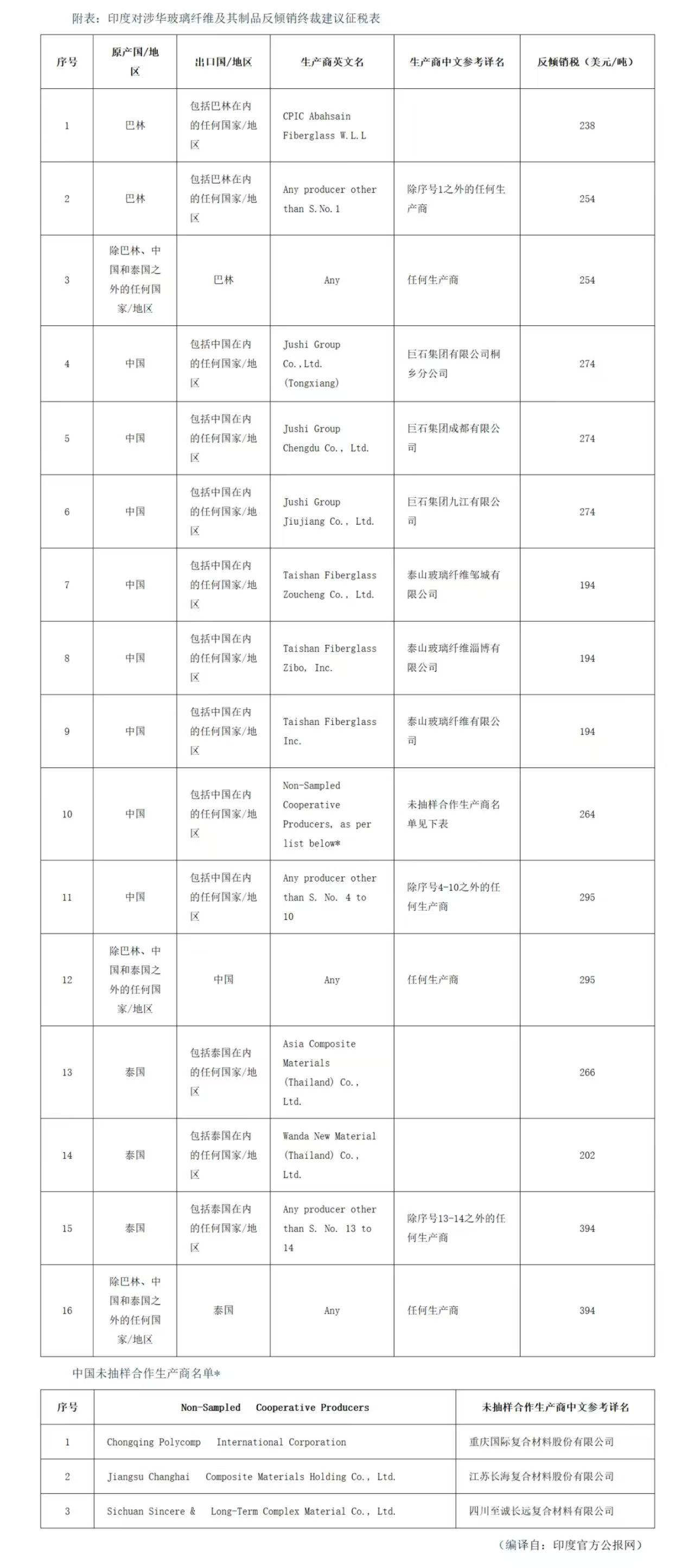 2025年9月8日,印度商工部发布公告,对原产于或进口自中国、巴林和泰国的玻璃纤维及其制品(Glass Fibre and articles thereof)作出反倾销肯定性终裁,建议对上述国家的涉案产品征收为期5年的反倾销税,分别如下:中国为194-295美元/吨,巴林为238-254美元/吨,泰国为202-394美元/吨,征税详情见附表。涉案产品包括玻璃纤维组合粗纱(AR)和玻璃纤维直接粗纱(DR)、玻璃短切原丝(CS)和玻璃短切原丝毡(CSM)。本案涉及印度海关编码7019项下的产品。