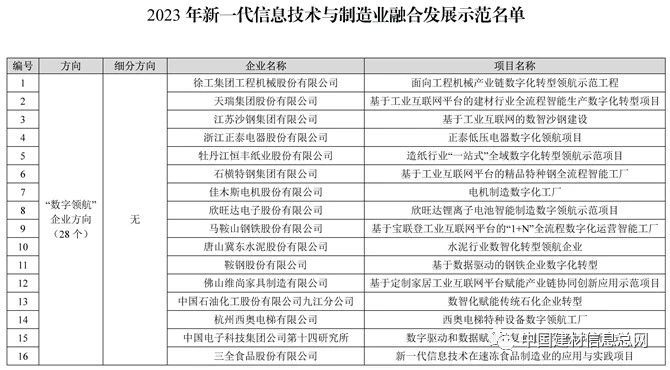 据介绍,此次遴选以新一代信息技术与制造业融合发展为主题,围绕典型产品、典型应用、典型服务模式等方向,遴选一批优秀典型案例,经企业自主申报、地方推荐、专家评审等环节,形成了2023年新一代信息技术与制造业融合发展示范名单。