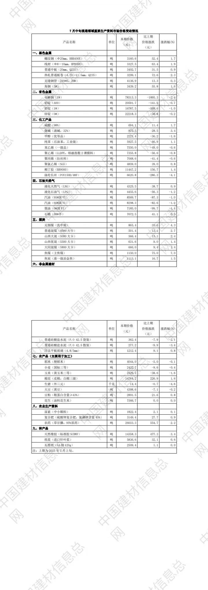 7月24日,国家统计局对全国流通领域9大类50种重要生产资料市场价格的监测显示,2025年7月中旬与7月上旬相比,28种产品价格上涨,20种下降,2种持平。其中,包括普通硅酸盐水泥(P.O 42.5袋装)、普通硅酸盐水泥(P.O 42.5散装)及浮法平板玻璃(4.8/5mm)3种非金属建材价格情况。