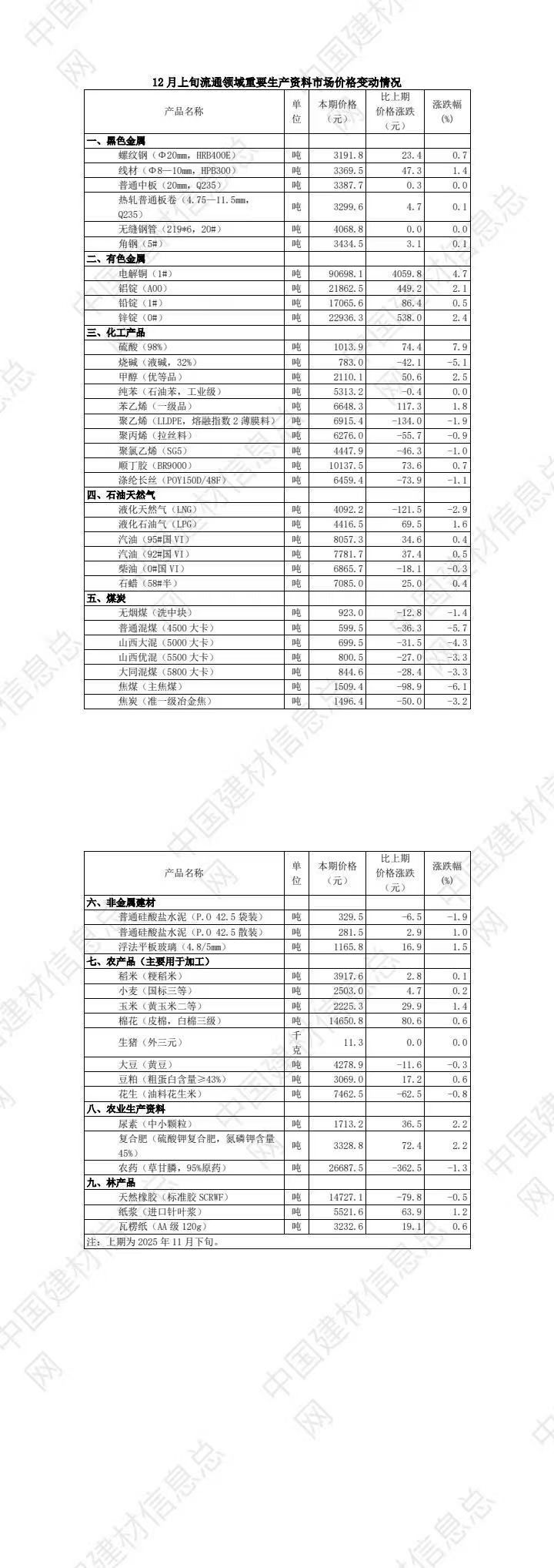 国家统计局近日对全国流通领域9大类50种重要生产资料市场价格的监测显示,2025年12月上旬与11月下旬相比,27种产品价格上涨,19种下降,4种持平。其中,包括普通硅酸盐水泥(P.O 42.5袋装)、普通硅酸盐水泥(P.O 42.5散装)及浮法平板玻璃(4.8/5mm)3种非金属建材价格情况。