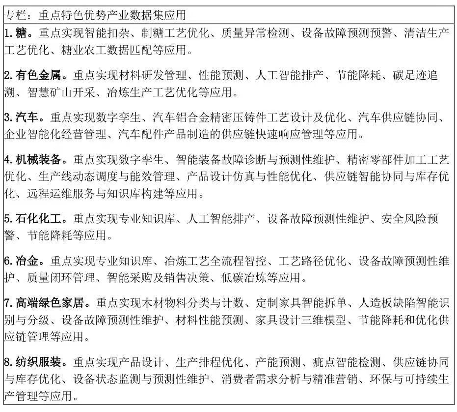 聚焦糖、有色金属、汽车、机械装备、石化化工、冶金、高端绿色家居、纺织服装等广西重点特色优势产业,鼓励其他产业积极探索,坚持场景需求和问题导向,梳理数据集应用需求。