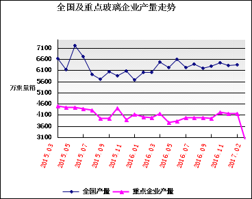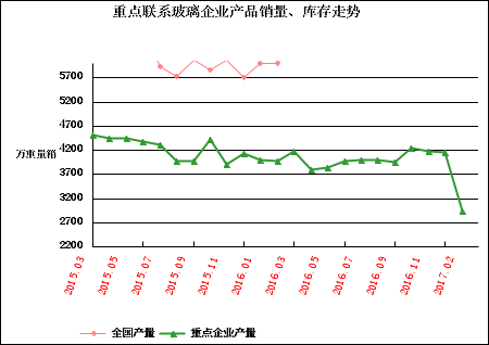 2017年02月汇总平板玻璃企业生产平板玻璃2951.57万重量箱,同比上涨0.19%;累计生产平板玻璃6038.30万重量箱,同比下降0.64%,本月销售平板玻璃2735.74万重量箱, 同比增长31.93%,累计销售平板玻璃4940.89万重量箱,同比下降0.55%,本月平板玻璃销售率为92.69%,比上年同期上涨21.47个百分点。月末平板玻璃库存3215.58万重量箱,同比下降27.62%。本月汇总的重点联系玻璃企业产品销量有所上涨,市场需求持续向好,库存继续下降。