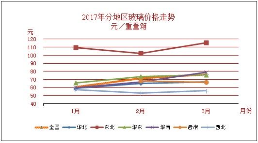 统计数据显示: 3月六地区玻璃产品价格中,除西南区出现微幅回调,其余各大地区价格继续稳中上涨,区域价格处于高位。汇总玻璃企业产品平均价格为76.57元/重量箱,比上月上涨2.79元/重量箱,环比上涨6.84%,比上年同期上涨22.83元/重量箱,涨幅为42.48%,其中:华北地区为66.81元/重量箱,环比上涨1.4%,同比上涨25.94%;东北地区价格为115.47元/重量箱,环比上涨12.72%,同比上涨18.36%;华东地区为75.71元/重量箱,环比上涨2.81%,同比上涨21.06%;华南地区为78.75元/重量箱,环比上涨17.45%,同比上涨46.76%;西南地区为66.5元/重量箱,环比下降2.85%,同比上涨7.71%;西北地区为56.16元/重量箱,环比上涨5.9%,同比上涨16.2%;