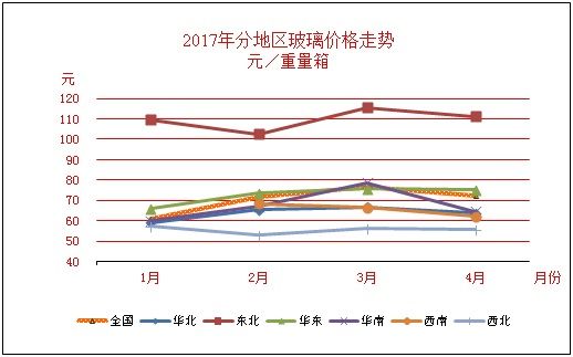 统计数据显示: 4月六地区玻璃产品价格中,各大地区价格均有小幅下降,但区域价格处于高位。汇总玻璃企业产品平均价格为72.12元/重量箱,比上月下降4.45元/重量箱,环比下降5.81%,比上年同期上涨17.54元/重量箱,涨幅为32.14%,其中:华北地区为63.87元/重量箱,环比下降4.45%,同比上涨18.67%;东北地区价格为111.32/重量箱,环比下降4.15%,同比上涨16.6%;华东地区为75.27元/重量箱,环比下降0.58%,同比上涨18.42%;华南地区为64.48元/重量箱,环比下降18.12%,同比上涨22.21%;西南地区为62.04元/重量箱,环比下降6.71%,同比上涨3.43%;西北地区为55.74元/重量箱,环比下降0.75%,同比上涨23.39%;