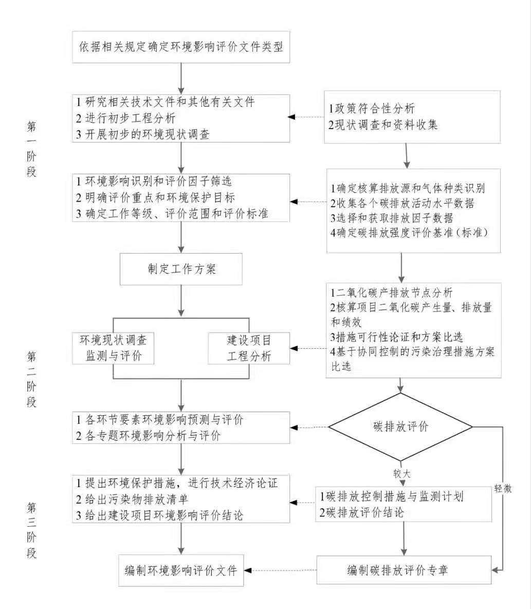 《指南》规定了建设项目环评工作中碳排放评价的一般工作流程、内容、方法和要求。碳排放评价工作主要内容包括政策符合性分析、现状调查和资料收集、工程分析、措施可行性论证和方案比选、碳排放评价、碳排放控制措施与监测计划、评价结论。
