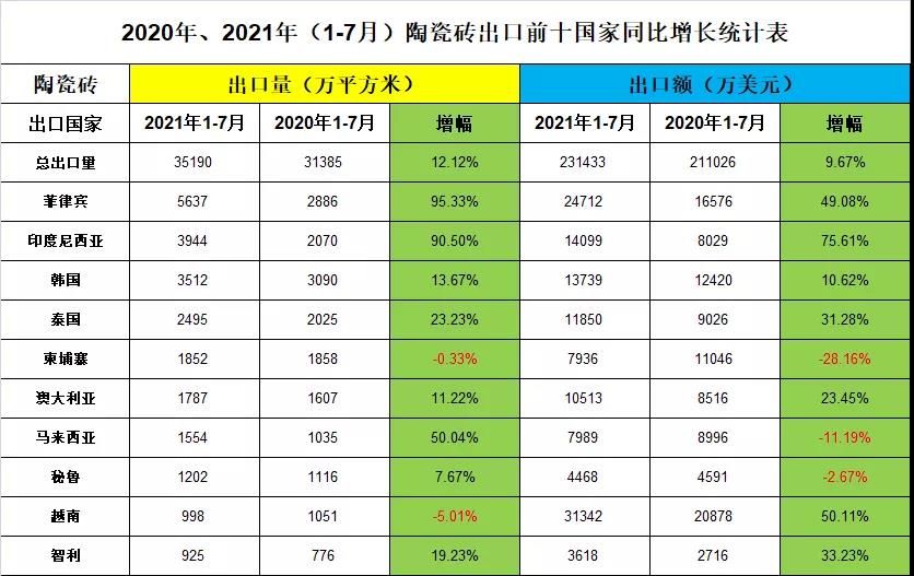 2021年前七个月,我国陶瓷砖总出口量为35190万平方米,较2020年同期的出口量31385万平方米同比增长12.12%;出口额为231433万美元,较2020年同期的出口额211026万美元同比增长了9.67%。