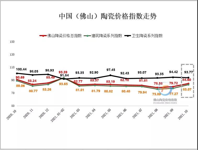 2021年10月佛山陶瓷价格总指数报84.60点,环比涨幅6.12%,同比跌幅6.72%;建筑陶瓷系列指数报83.07点,环比涨幅7.51%,同比跌幅6.73%;卫生陶瓷系列指数报93.77点,环比跌幅0.69%,同比跌幅6.64%。10月,佛山陶瓷卫浴企业受生产成本上涨及限产影响,大部分产品价格继续上调,推动总指数的涨幅。本月建筑陶瓷系列指数大幅上涨,卫生陶瓷系列指数小幅下跌,市场行情小幅回暖,产品成交总量呈回升态势。