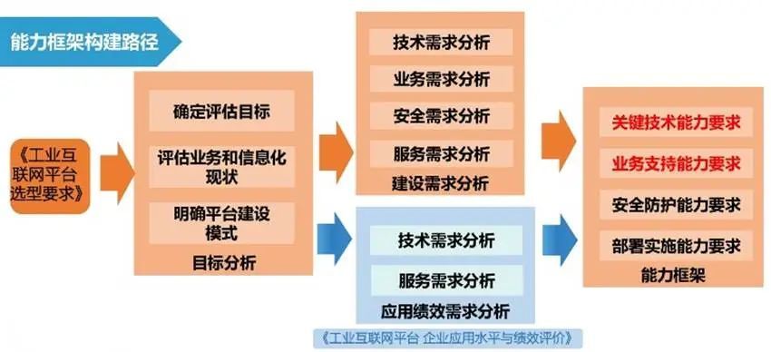 《工业互联网平台选型要求》规定了工业互联网平台的选型原则和选型流程,明确了工业互联网平台应满足的9大关键技术能力和基于平台对企业赋能的18项业务支持能力,为工业互联网平台供给方“建能力”、需求方“选平台”提供参考。《工业互联网平台企业应用水平与绩效评价》提出了覆盖工业互联网平台应用全局、全过程、全要素的应用水平与绩效评价体系,能够有效引导企业科学评价工业互联网平台应用成效,加速推进平台应用“走深向实”。融合两项国家标准的主要内容,围绕业务适用、技术适用、经济合理原则构建选型能力要求框架,按照“目标分析-需求分析-能力框架”的路径构建能力框架。