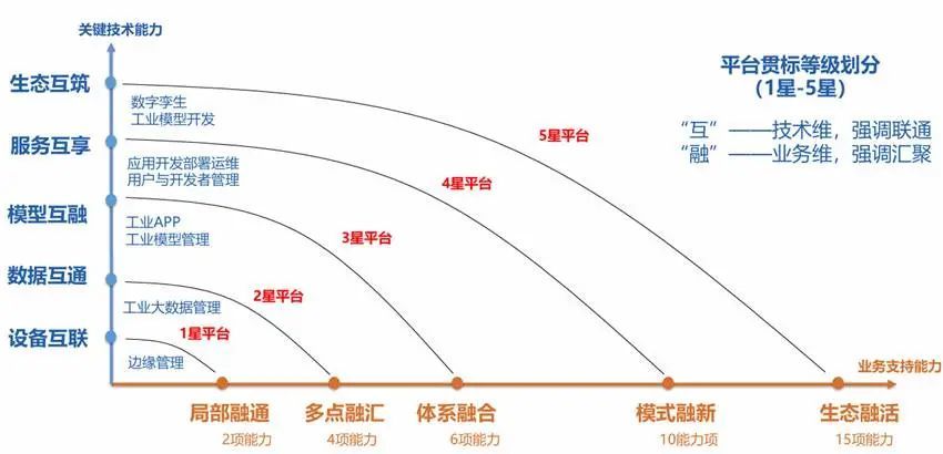 工业互联网平台贯标综合技术和业务两个维度,将工业互联网平台划分为1星平台、2星平台、3星平台、4星平台、5星平台五个等级,建立贯标星级跃升坐标图,对两个维度进行一一映射。其中,技术维度以“互”加深技术联通,分为“设备互联—数据互通—模型互融—服务互享—生态互筑”5个层级,应用维度以“融”拓展业务汇聚,分为“局部融通—多点融汇—体系融合—模式融新—生态融活”5个层级,共同推进平台贯标等级划分及不断提升。