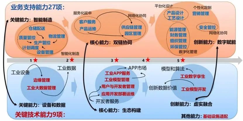 基于《工业互联网平台选型要求》《工业互联网平台关键技术能力企业应用水平与绩效评价》形成平台评估能力项。根据星级评估要求,每一个星级对于关键技术能力和业务支持能力都具备必选项和可选项。