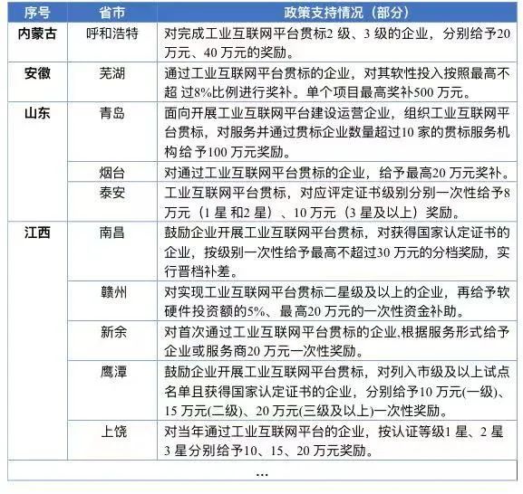 党和国家高度重视工业互联网平台发展,内蒙古、安徽、山东、江西等各省市地区纷纷出台措施推进工业互联网平台贯标工作,对不同星级贯标达标企业给予政策支持。