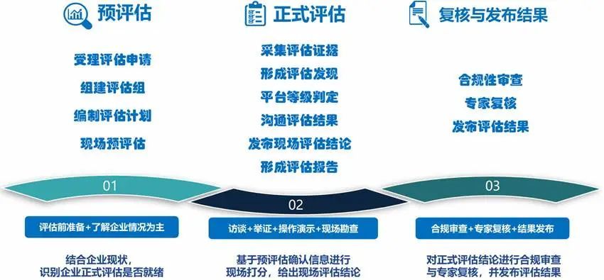 工业互联网平台贯标评估整体流程分为预评估、正式评估和复核与结果发布三个阶段。企业应结合自身情况,选择自行开展贯标或聘请贯标咨询机构进行指导。